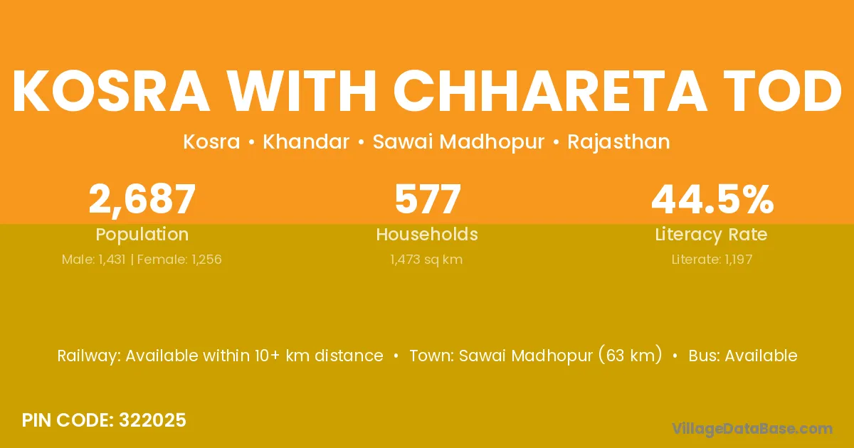 Kosra With Chhareta Tod village has a total population of 2,687 people, of which 1,431 are males and 1,256 are females.