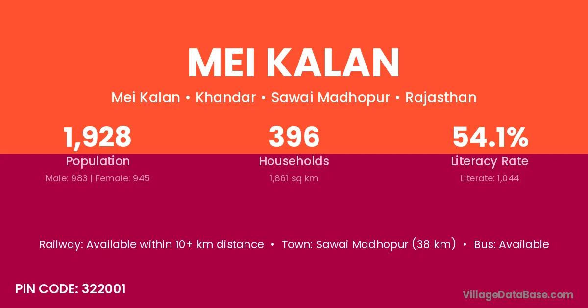 Sawai Madhopur (38 km) is the nearest town to Mei Kalan village for major economic activities and is located approximately 38 km away.