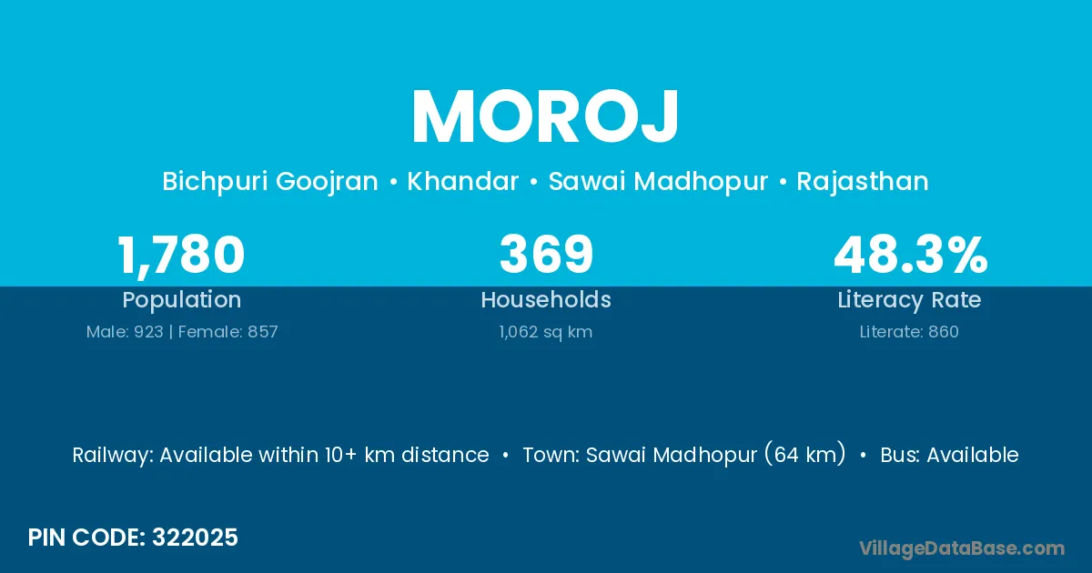 Sawai Madhopur (64 km) is the nearest town to Moroj village for major economic activities and is located approximately 64 km away.