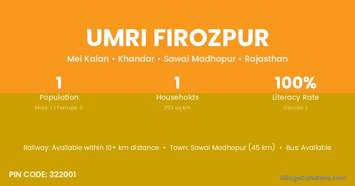 Sawai Madhopur (45 km) is the nearest town to Umri Firozpur village for major economic activities and is located approximately 45 km away.