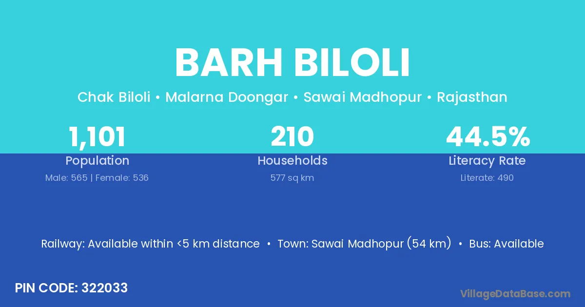 Sawai Madhopur (54 km) is the nearest town to Barh Biloli village for major economic activities and is located approximately 54 km away.