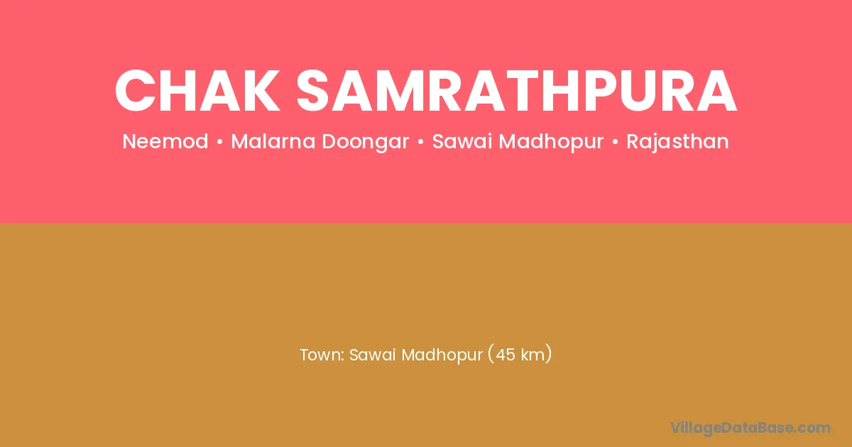 Sawai Madhopur (45 km) is the nearest town to Chak Samrathpura village for major economic activities and is located approximately 45 km away.