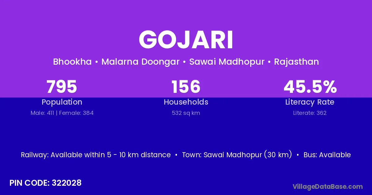 Sawai Madhopur (30 km) is the nearest town to Gojari village for major economic activities and is located approximately 30 km away.