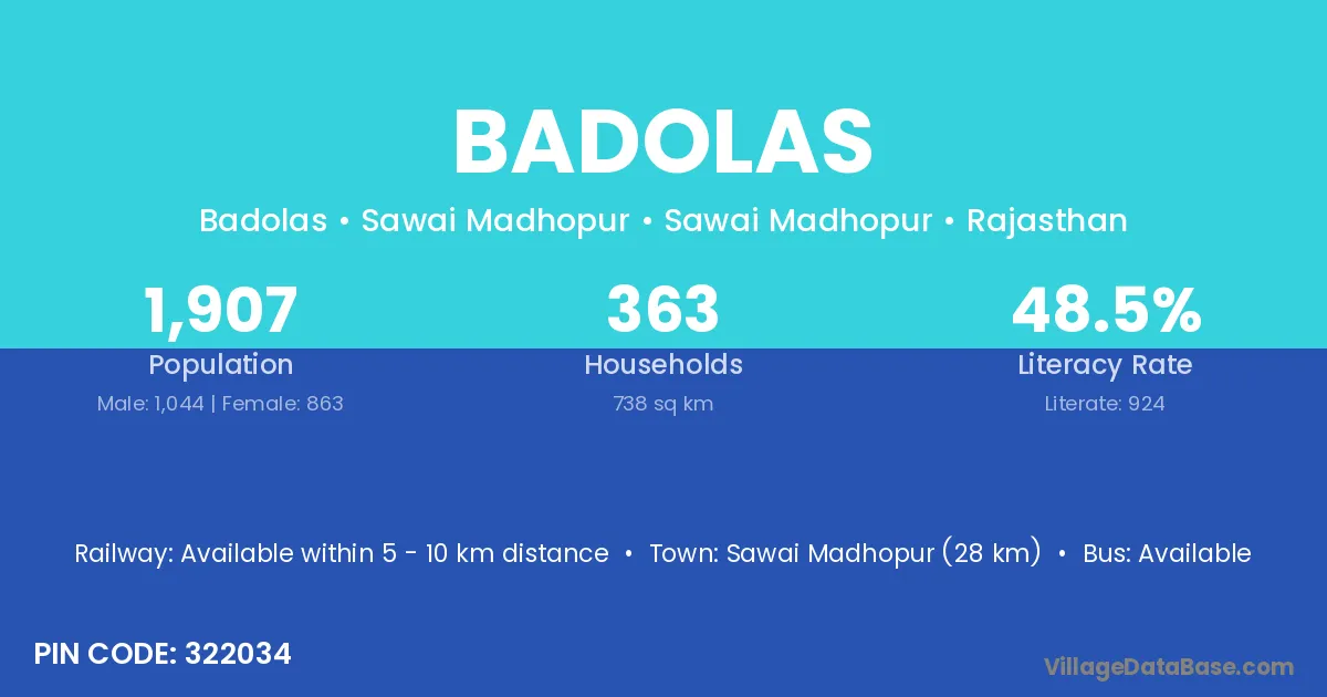 Sawai Madhopur (28 km) is the nearest town to Badolas village for major economic activities and is located approximately 28 km away.
