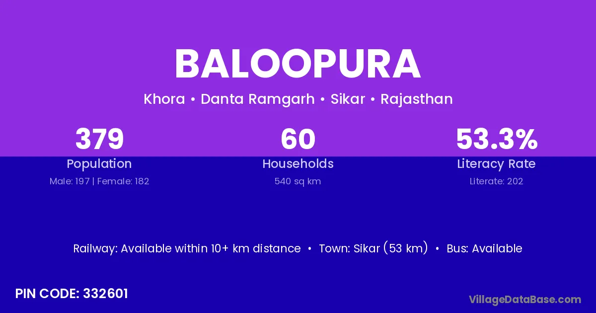 Sikar (53 km) is the nearest town to Baloopura village for major economic activities and is located approximately 53 km away.