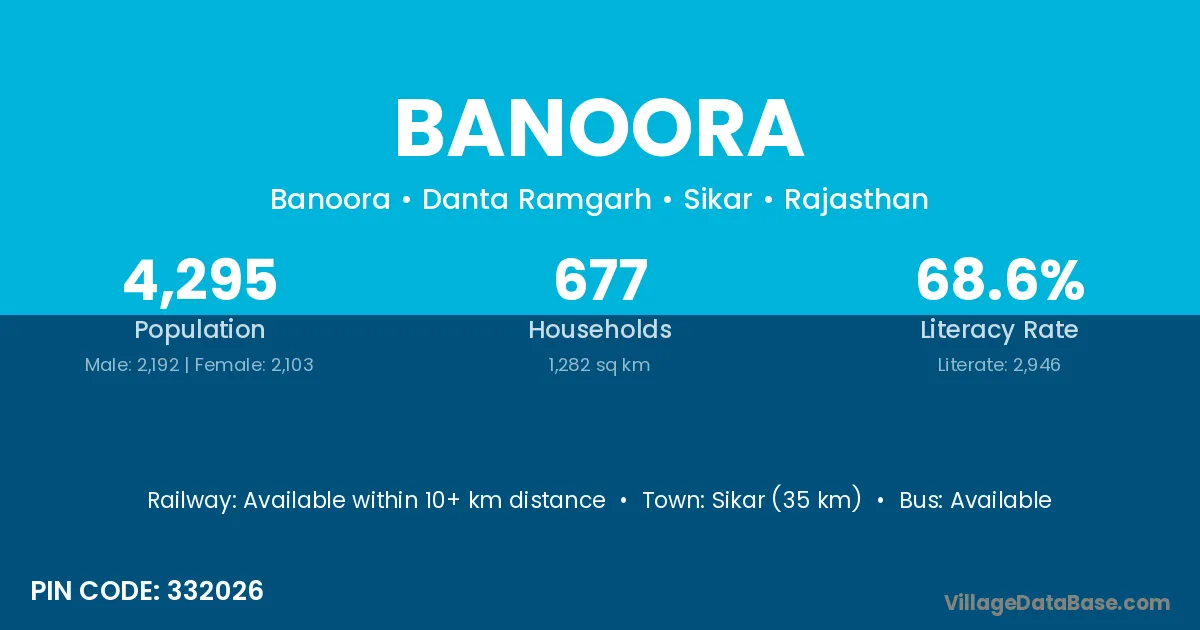 Sikar (35 km) is the nearest town to Banoora village for major economic activities and is located approximately 35 km away.