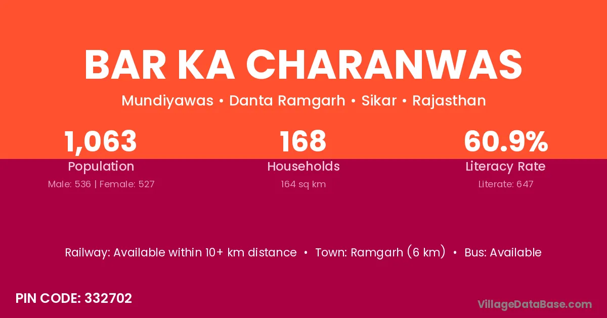 Bar Ka Charanwas village has a total population of 1,063 people, of which 536 are males and 527 are females.