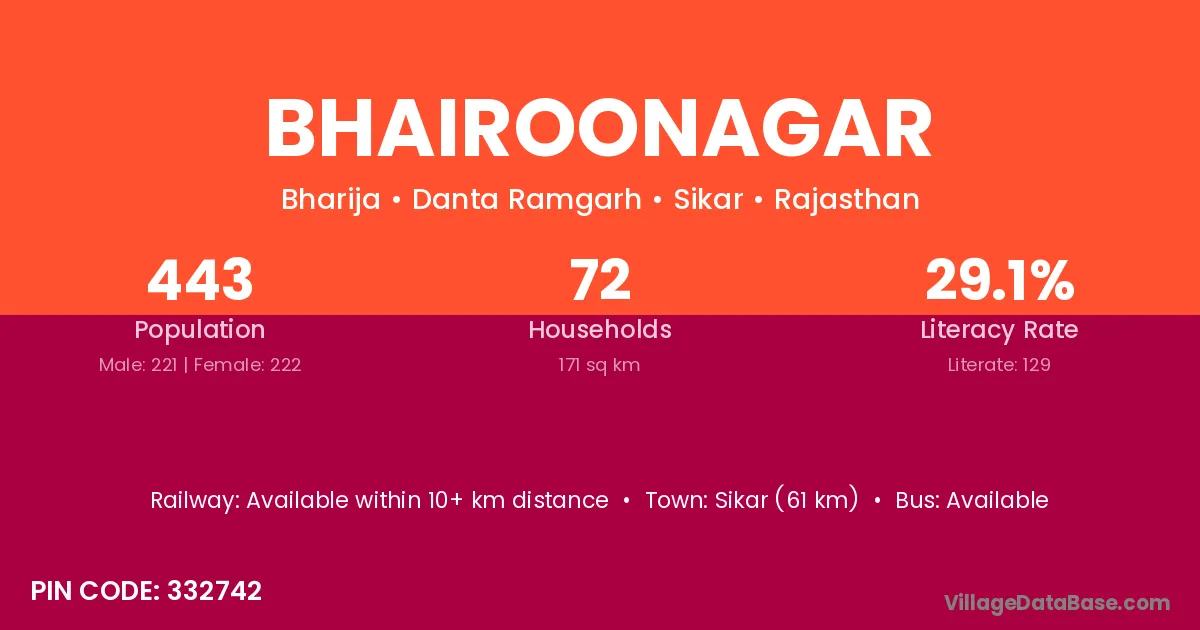 Bhairoonagar village has a total population of 443 people, of which 221 are males and 222 are females.