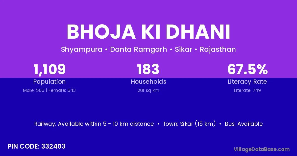 Bhoja Ki Dhani village has a total population of 1,109 people, of which 566 are males and 543 are females.