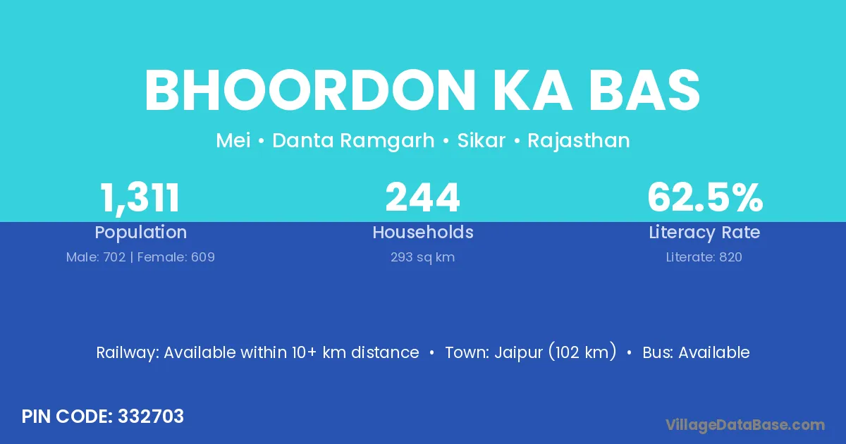 Bhoordon Ka Bas village has a total population of 1,311 people, of which 702 are males and 609 are females.