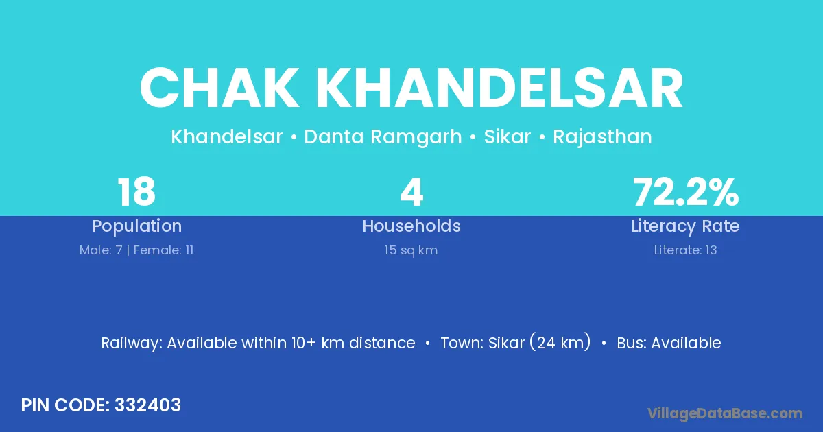 Chak Khandelsar village has a total population of 18 people, of which 7 are males and 11 are females.