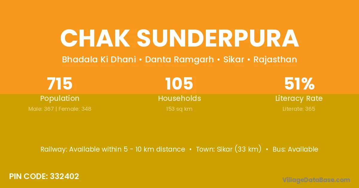 Sikar (33 km) is the nearest town to Chak Sunderpura village for major economic activities and is located approximately 33 km away.