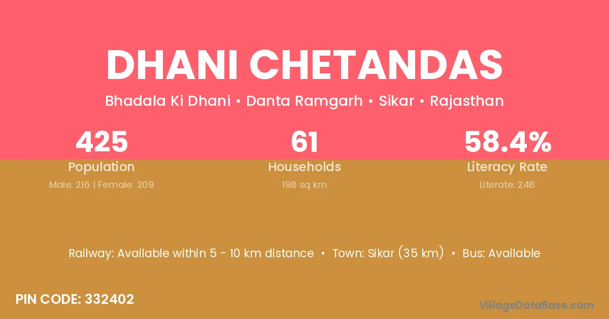 Dhani Chetandas village has a total population of 425 people, of which 216 are males and 209 are females.