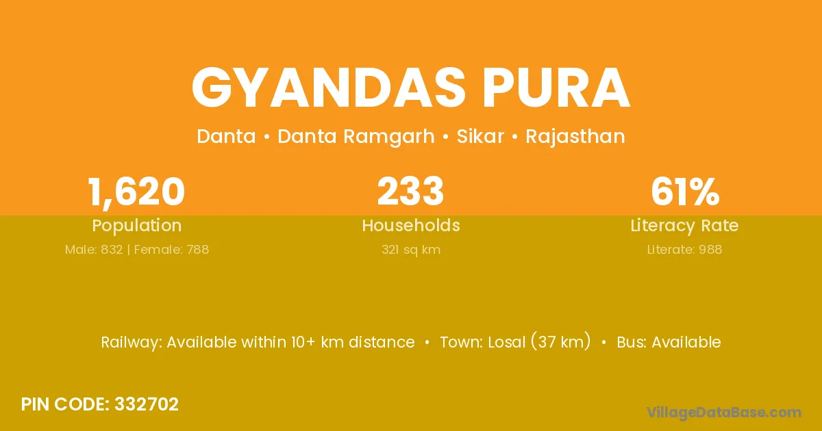 Losal (37 km) is the nearest town to Gyandas Pura village for major economic activities and is located approximately 37 km away.