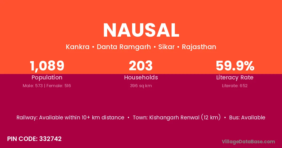 Kishangarh Renwal (12 km) is the nearest town to Nausal village for major economic activities and is located approximately 12 km away.
