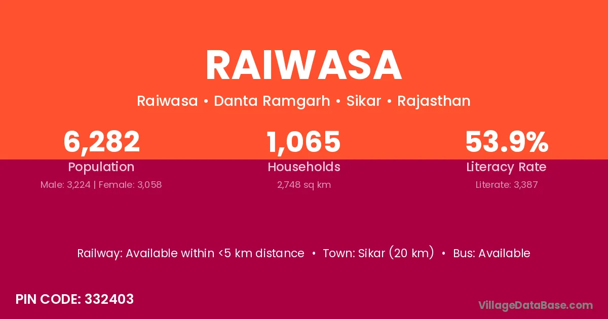 Sikar (20 km) is the nearest town to Raiwasa village for major economic activities and is located approximately 20 km away.