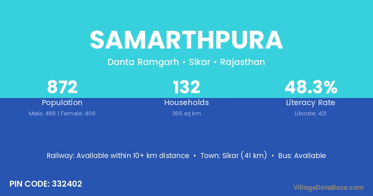 Sikar (41 km) is the nearest town to Samarthpura village for major economic activities and is located approximately 41 km away.