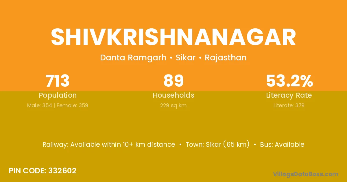 Sikar (65 km) is the nearest town to Shivkrishnanagar village for major economic activities and is located approximately 65 km away.