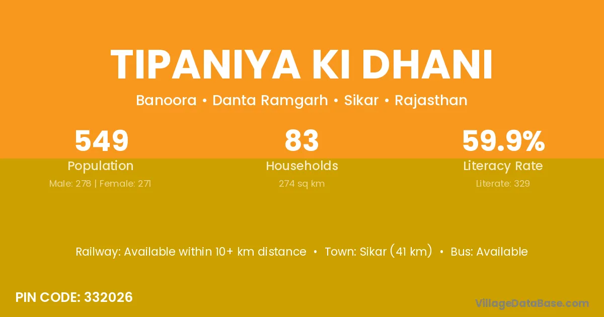Tipaniya Ki Dhani village has a total population of 549 people, of which 278 are males and 271 are females.