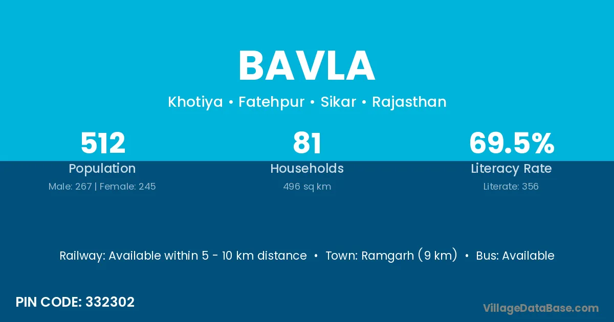 Ramgarh (9 km) is the nearest town to Bavla village for major economic activities and is located approximately 9 km away.
