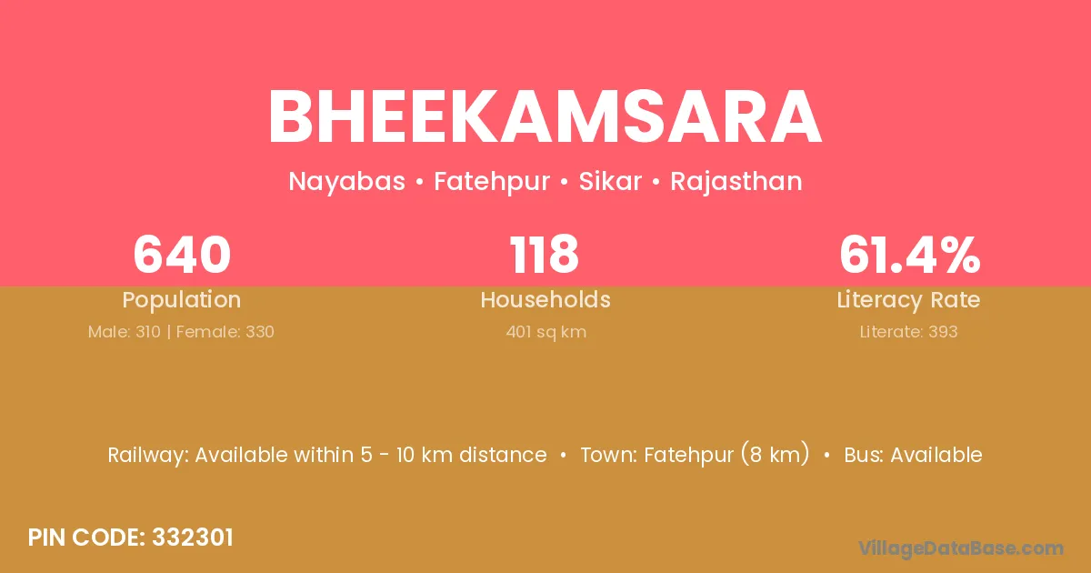 Bheekamsara village has a total population of 640 people, of which 310 are males and 330 are females.