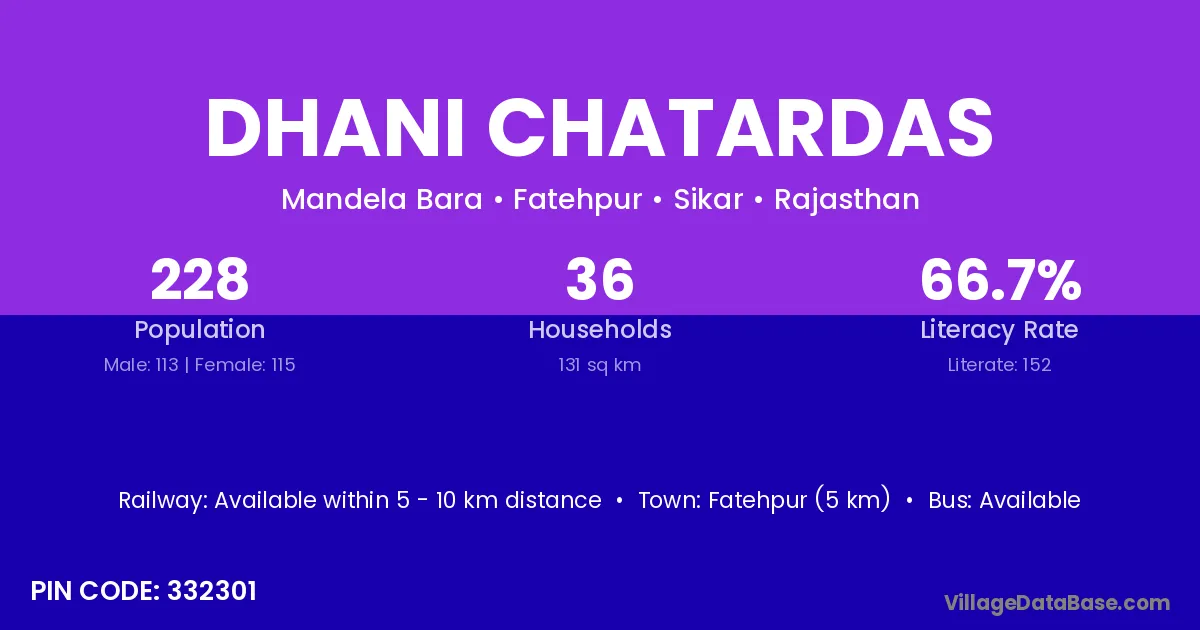 Dhani Chatardas village has a total population of 228 people, of which 113 are males and 115 are females.