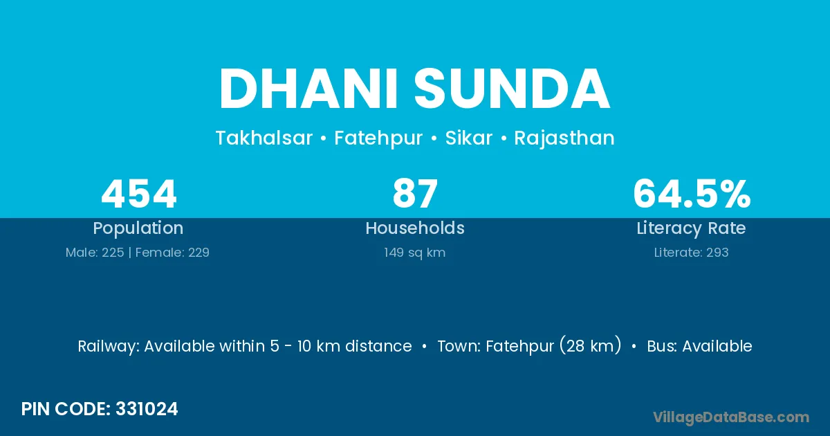 Fatehpur (28 km) is the nearest town to Dhani Sunda village for major economic activities and is located approximately 28 km away.