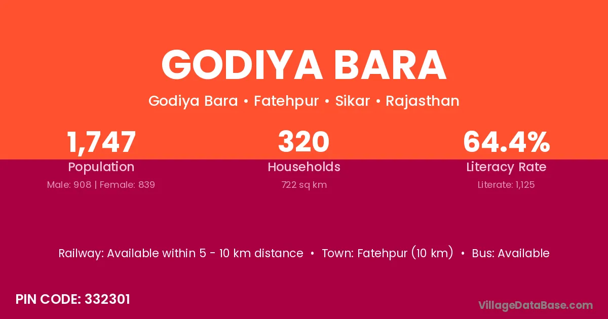 Godiya Bara village has a total population of 1,747 people, of which 908 are males and 839 are females.