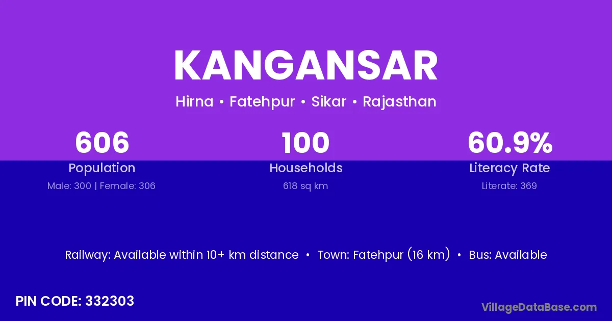 Kangansar village has a total population of 606 people, of which 300 are males and 306 are females.
