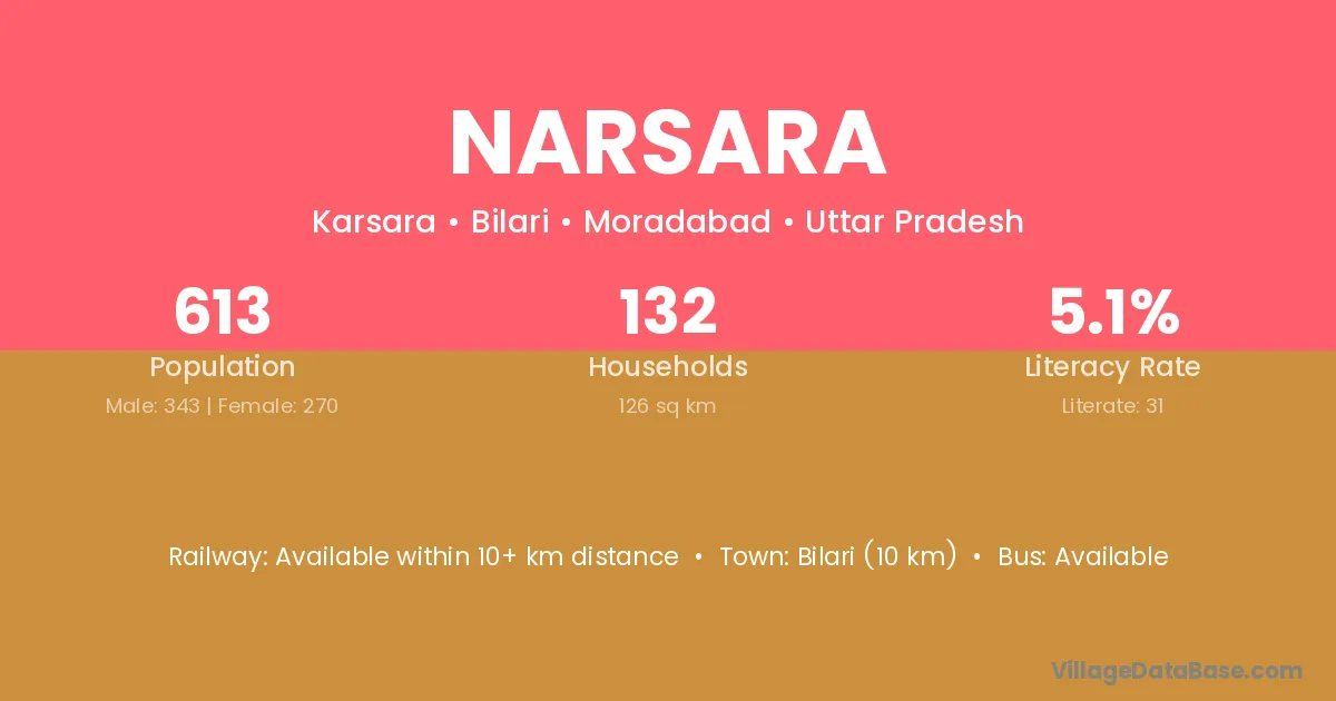 Narsara village has a total population of 1,211 people, of which 589 are males and 622 are females.