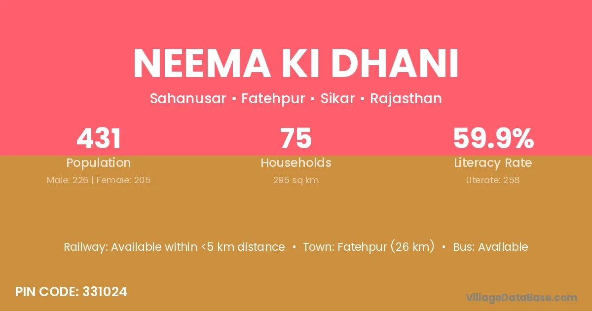 Neema Ki Dhani village has a total population of 431 people, of which 226 are males and 205 are females.