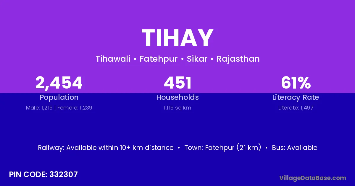 Fatehpur (21 km) is the nearest town to Tihay village for major economic activities and is located approximately 21 km away.