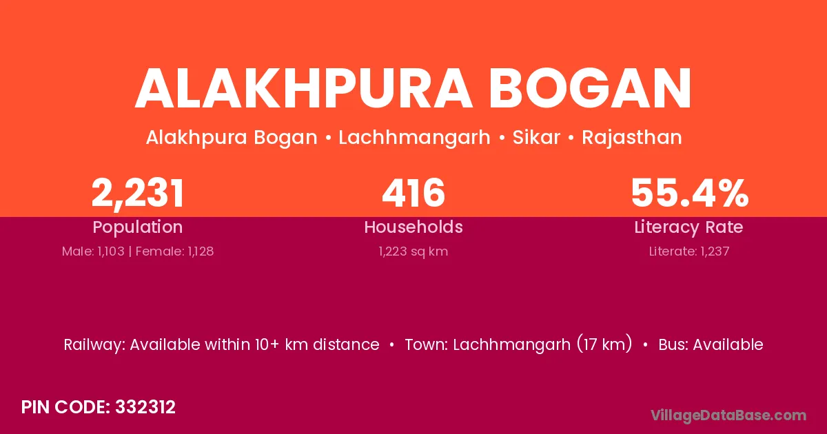 Alakhpura Bogan village has a total population of 2,231 people, of which 1,103 are males and 1,128 are females.