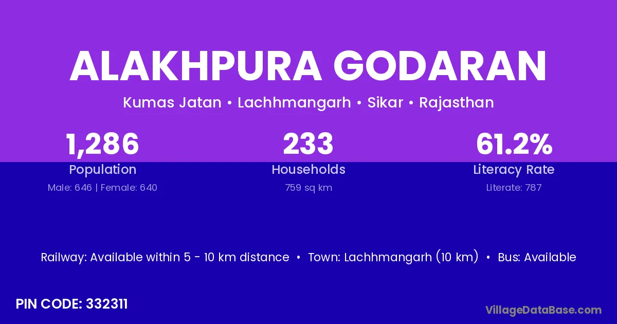 Alakhpura Godaran village has a total population of 1,286 people, of which 646 are males and 640 are females.