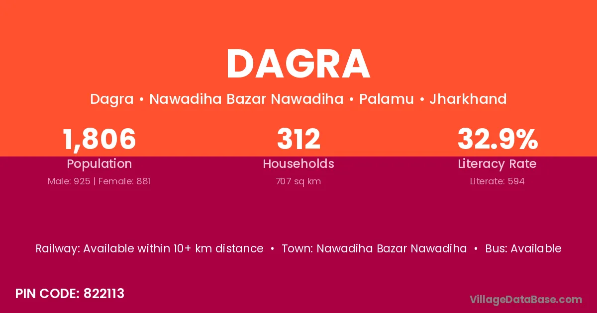 The literacy rate of Dagra village is 61.36%. Male literacy stands at 72.35% and female literacy at 49.90%.