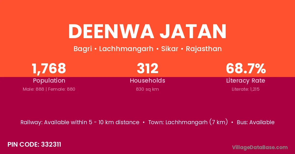 Lachhmangarh (7 km) is the nearest town to Deenwa Jatan village for major economic activities and is located approximately 7 km away.