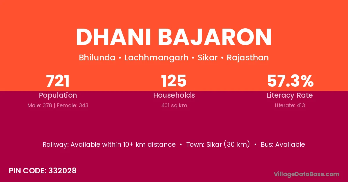 Dhani Bajaron village has a total population of 721 people, of which 378 are males and 343 are females.