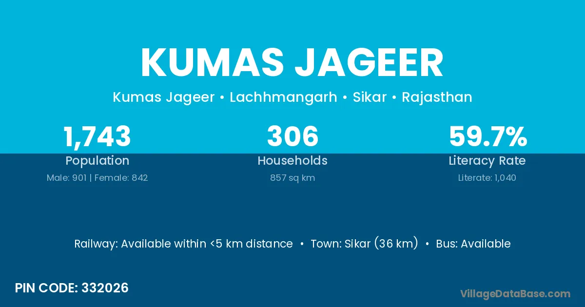 Sikar (36 km) is the nearest town to Kumas Jageer village for major economic activities and is located approximately 36 km away.