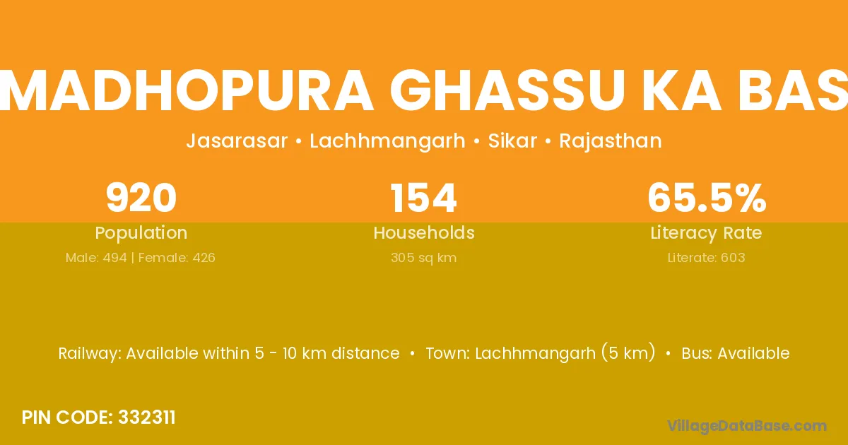 Madhopura Ghassu Ka Bas village has a total population of 920 people, of which 494 are males and 426 are females.