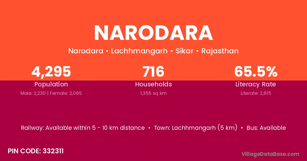 Lachhmangarh (5 km) is the nearest town to Narodara village for major economic activities and is located approximately 5 km away.
