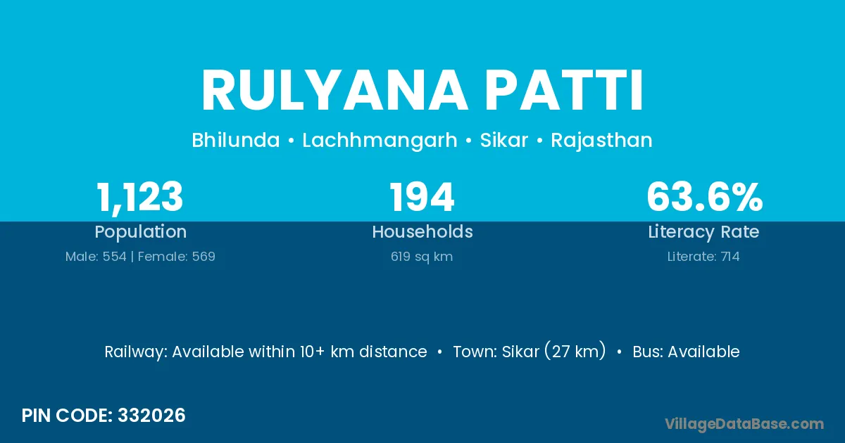 Sikar (27 km) is the nearest town to Rulyana Patti village for major economic activities and is located approximately 27 km away.