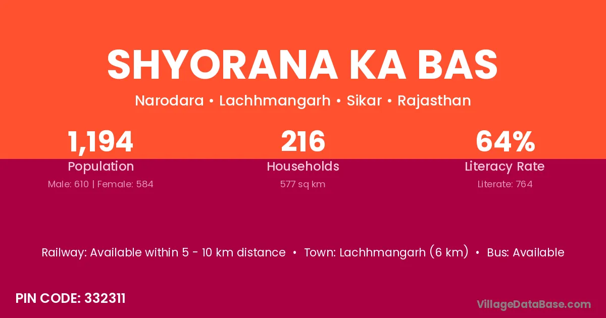 Shyorana Ka Bas village has a total population of 1,194 people, of which 610 are males and 584 are females.
