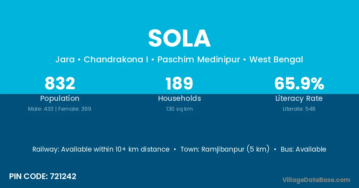 The literacy rate of Sola village is 54.66%. Male literacy stands at 66.84% and female literacy at 42.23%.