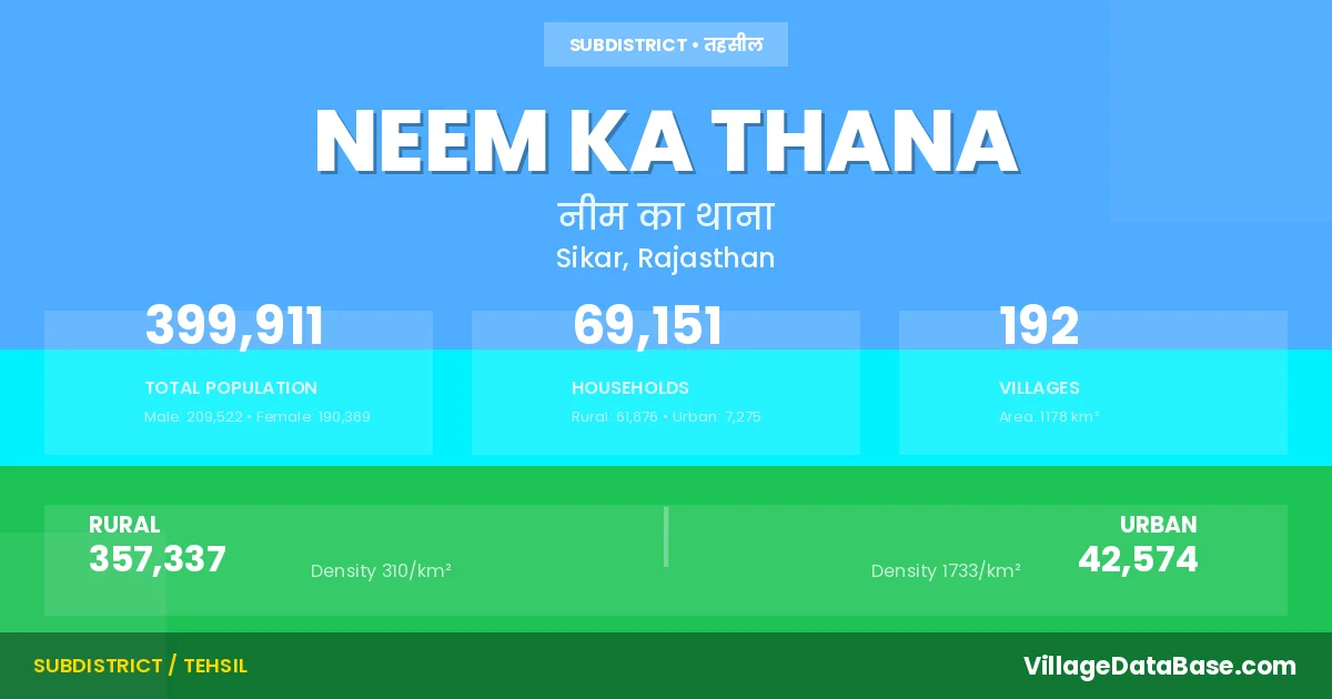 According to the 2011 census The total area of Neem Ka Thana Tehsil is 1178 km², with a population of 399911 people. The population density is 339 inhabitants per square kilometre, and there are approximately 69151 houses in the sub district.