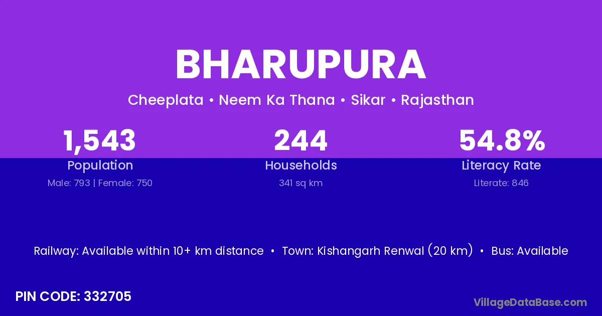 Kishangarh Renwal (20 km) is the nearest town to Bharupura village for major economic activities and is located approximately 20 km away.