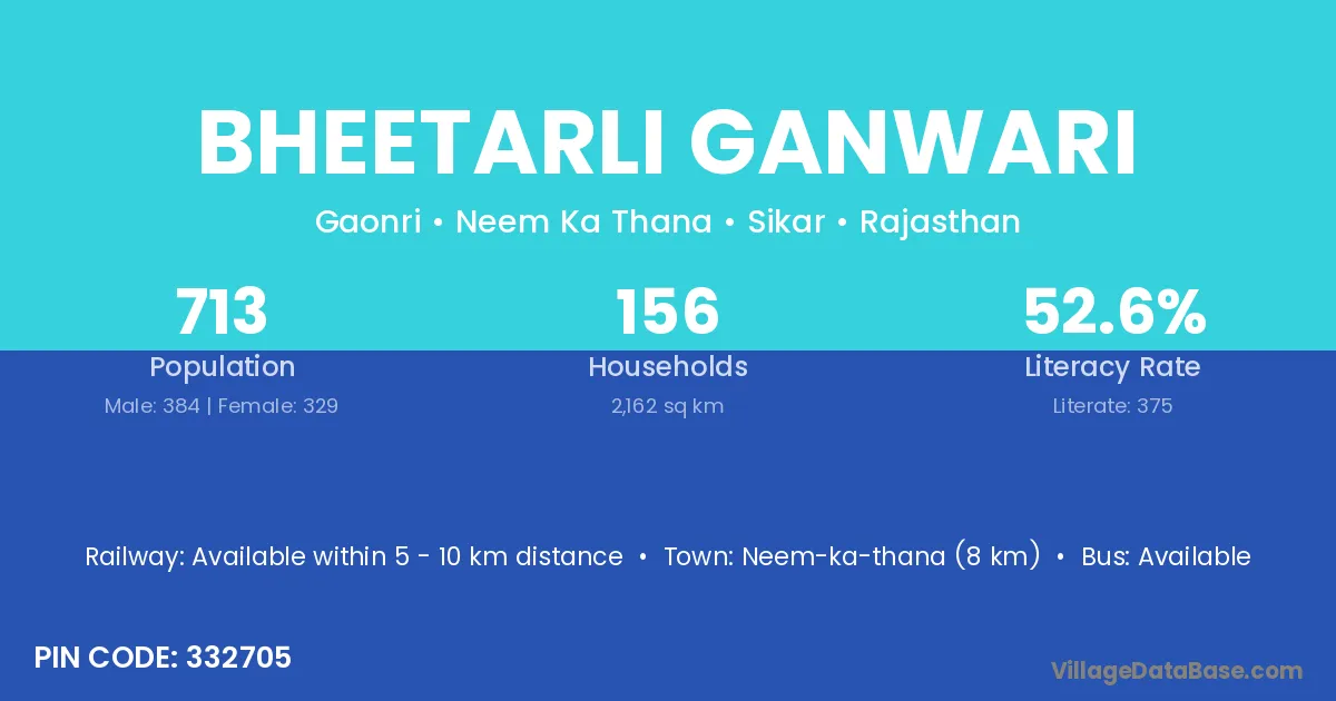 Neem-ka-thana (8 km) is the nearest town to Bheetarli Ganwari village for major economic activities and is located approximately 8 km away.