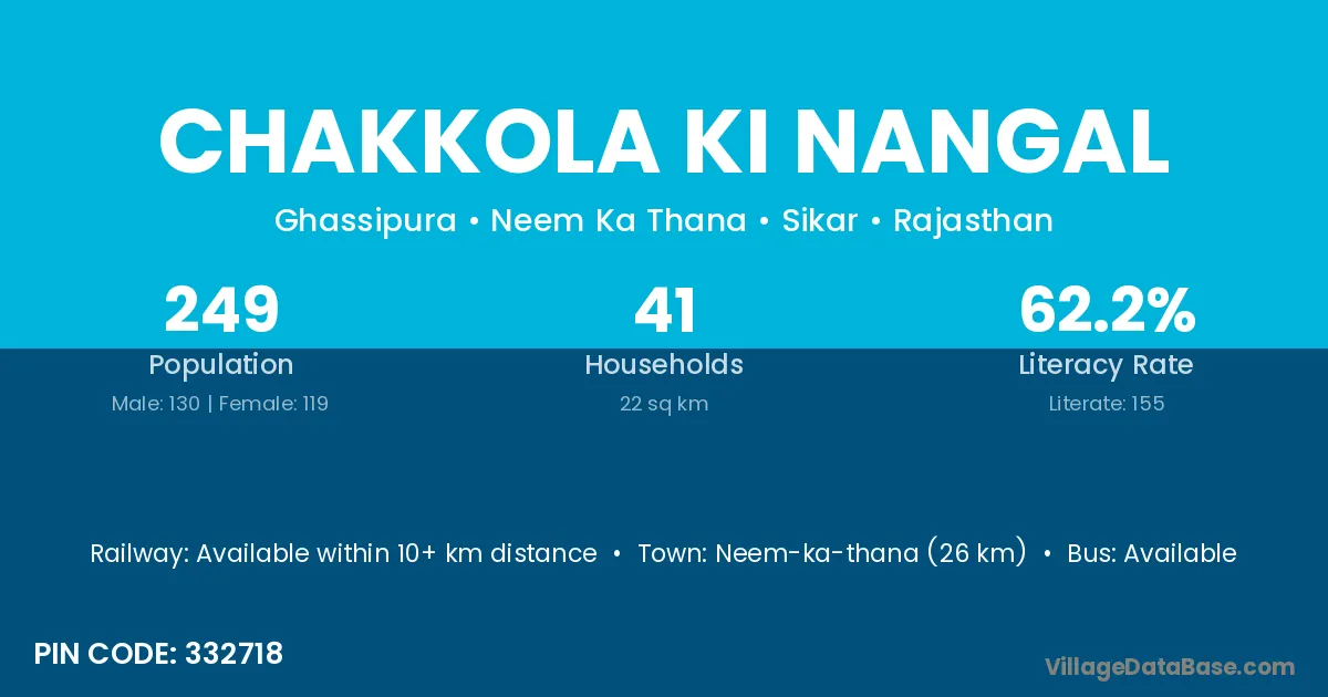 Chakkola Ki Nangal village has a total population of 249 people, of which 130 are males and 119 are females.