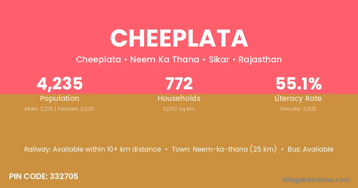Neem-ka-thana (25 km) is the nearest town to Cheeplata village for major economic activities and is located approximately 25 km away.