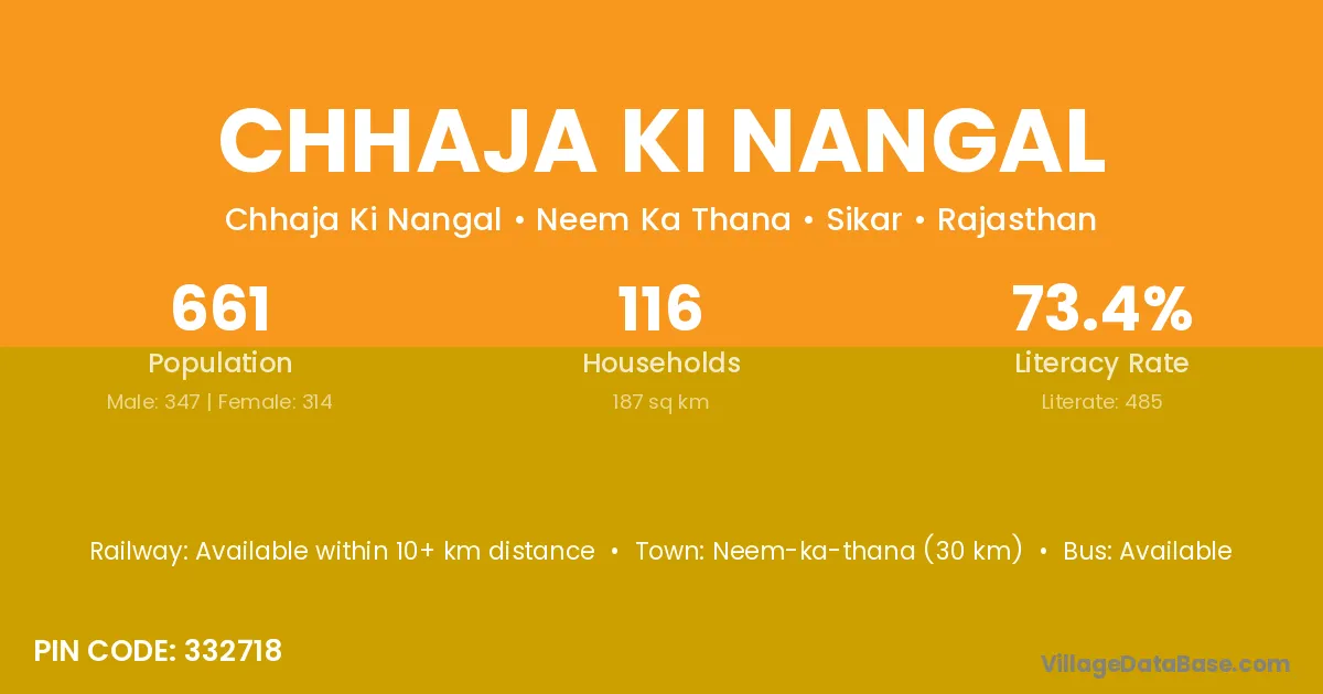 Neem-ka-thana (30 km) is the nearest town to Chhaja Ki Nangal village for major economic activities and is located approximately 30 km away.