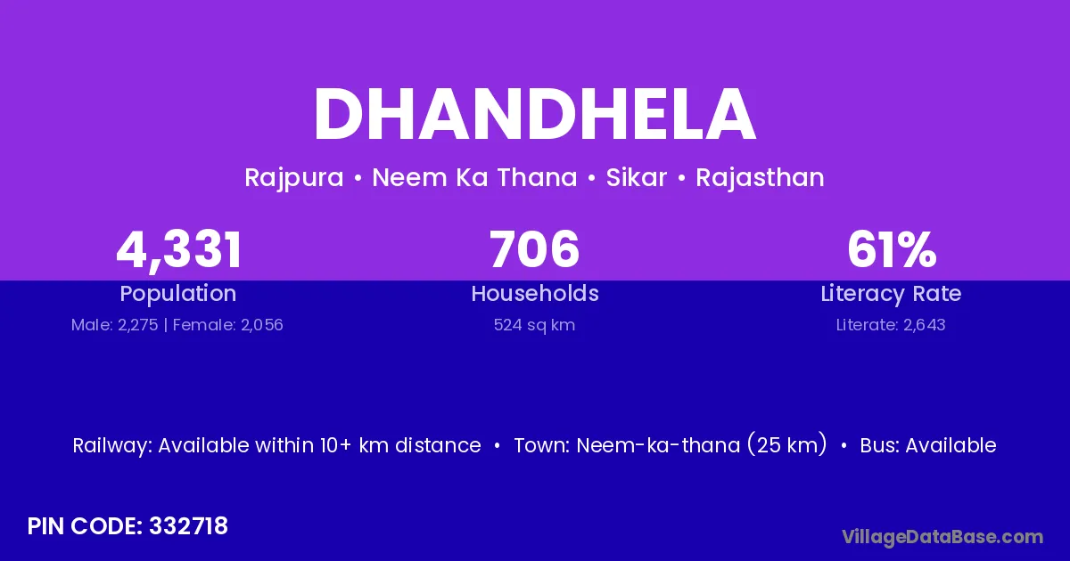 Neem-ka-thana (25 km) is the nearest town to Dhandhela village for major economic activities and is located approximately 25 km away.